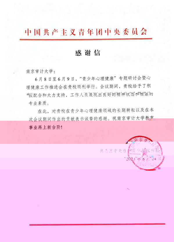 6月8日到9日,共青團中央維護青少年權益部在我校舉辦“青少年心理健康”專題研讨會暨心理健康工作推進會。團中央權益部特此給我校發來感謝信。在信中,團中央權益部對我校會議籌備與組織能力表示充分肯定,對我校在青少年心理健康領域的長期耕耘表達誠摯感謝,并祝我校教育事業再上新台階!