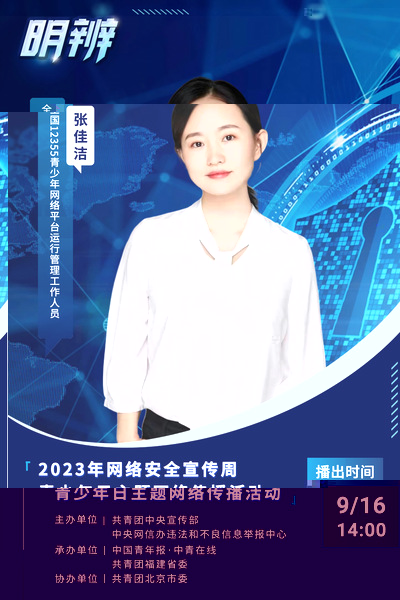 為深入宣傳貫徹習近平總書記關于網絡強國的重要思想及習近平總書記對網絡安全工作“四個堅持”的重要指示精神,進一步教育引導廣大青少年堅定“四個自信”,由共青團中央宣傳部和中央網信辦違法和不良信息舉報中心聯合主辦,中國青年報、中青在線和共青團福建省委聯合承辦,共青團北京市委協辦的“明辨”——2023年網絡安全宣傳周青少年日主題傳播活動于9月16日下午播出。我校伟德国际1946源于英国教師、全國12355青少年平台運營管理負責人張佳潔作為嘉賓參與直播活動。
